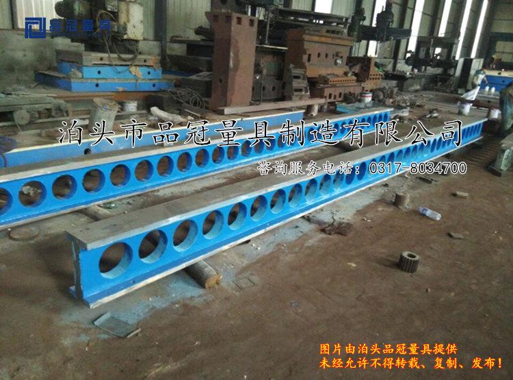 長條式鑄鐵平臺/條形鑄鐵平板,主要用于長條式型材及工件的檢驗、劃線基準工具,泊頭市品冠量具制造有限公司生產制造的長條式鑄鐵平臺材質采用高強度鑄鐵HT200-300,硬度為:HB170-220、HT-200材質配料時原料含量加配料按含碳量:3.1-3.4 錳:0.6-0.9 硅:1.5-2.0標準。長條式鑄鐵平臺經過兩次人工處理(人工退火600度-700度和自然時效2-3年)使用該產品的精度穩定,耐磨性能好用來進行工件的檢驗劃線工藝,和焊接平板不同,上面沒有孔,工作面為平面。